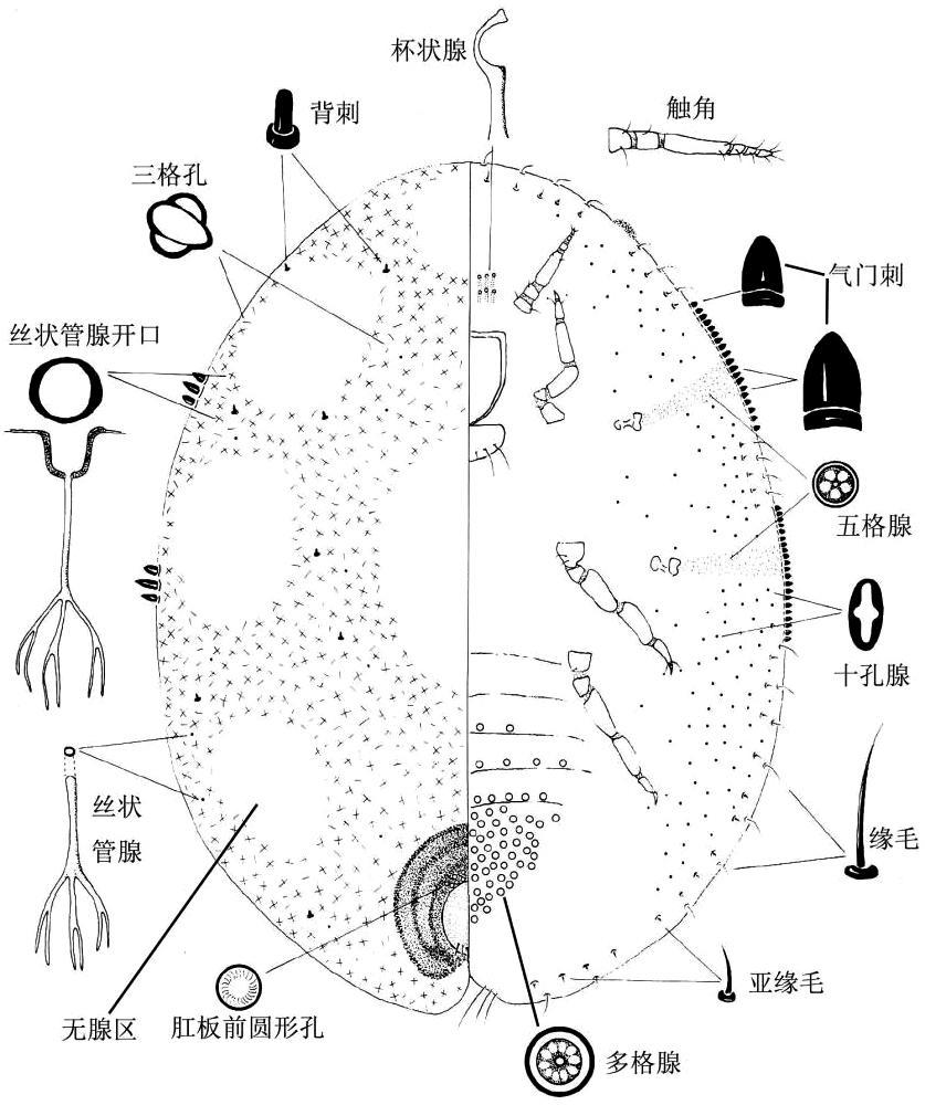 雌成虫虫体椭圆形(图2),触角6节,第3节最长。足3对,分节正常,胫跗关节硬化,爪下有1小齿,爪冠毛2根。体缘:气门刺钝圆锥形,体缘毛两眼点间长缘毛7~11根,眼点到前气门刺间每侧有1~5根,前后气门刺间每侧2~7根,后气门刺到体末有10~15根,其中 3 根尾毛较长。背面:无腺区8个,背侧各3个,头部1个,背中区1个;背刺短,端部钝;蜡蚧式孔多而散布,多为二格孔,也有少量三格孔和单孔环,单孔环有细丝管道,内末端多叉分枝,也称丝状管腺;肛板圆滑,肛板前圆形孔5~17个,肛环刺6根。腹面:五格腺从气门一直到气门刺以带状分布于气孔沟内;十字孔腺散布于腹面,大多数集中于亚缘区;多格腺集中分布于阴门周围及第6腹节,第3、4、5腹节有单条带的多格腺;杯状腺分布于两触角间,5~12个;1列亚缘毛分布亚缘区[7]。