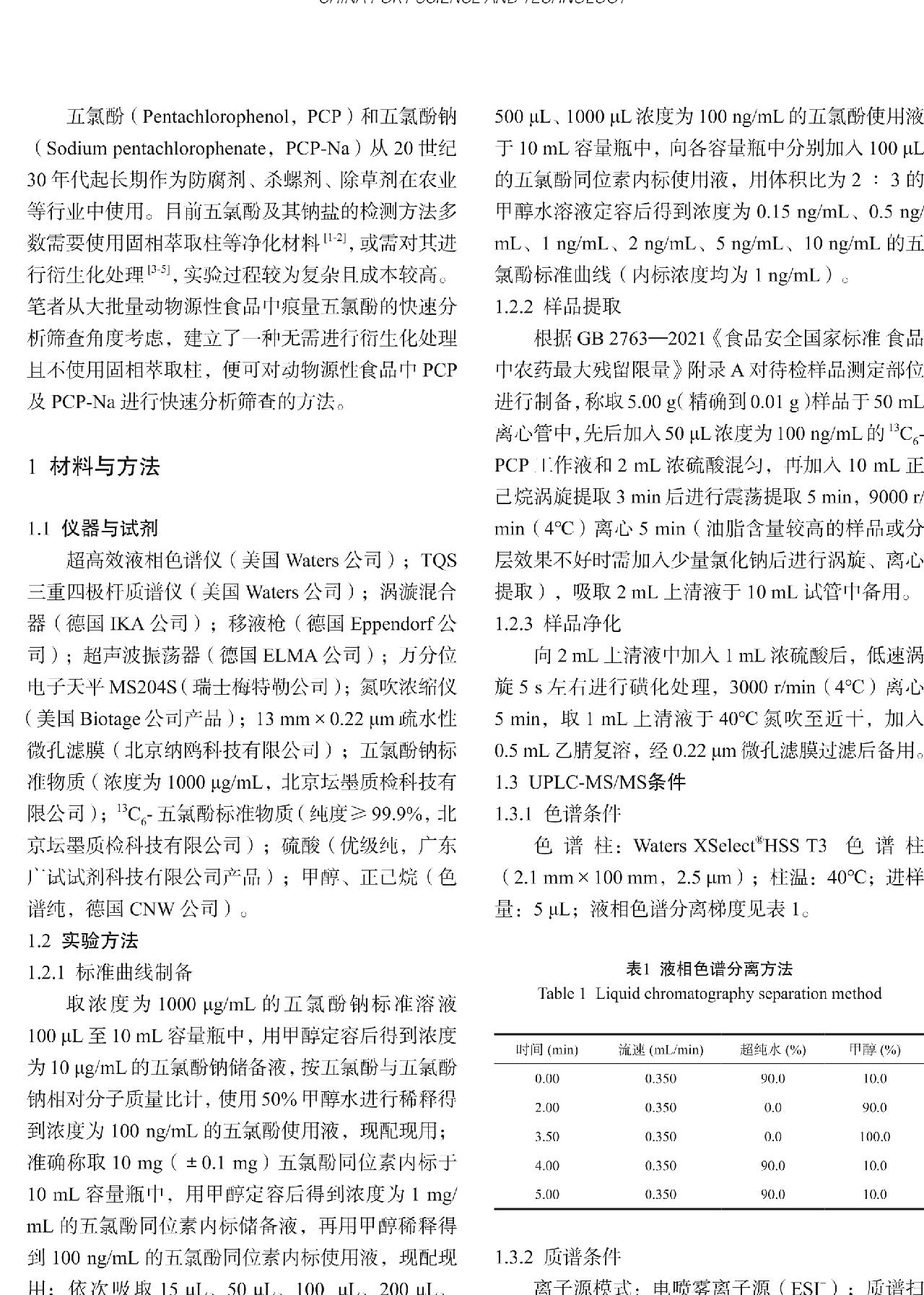 同位素内标稀释-UPLC/MS/MS快速筛查五氯酚及其钠盐残留
