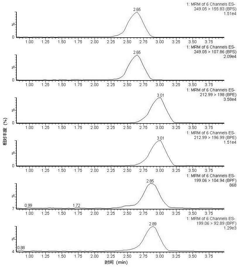 这12种双酚类化合物的分子结构均含有酚羟基,易在ESI源的负离子模式下获得较高丰度的[M-H]-准分子离子峰,因此选择负离子模式扫描的方式进行采集。对确定的母离子进行二级质谱扫描,并根据欧盟委员会关于分析法和结果说明的96/23/EC号理事会指令的实施决议(欧盟2002/657/EC指令),每种待测化合物选择2个主要特征碎片离子作为定性与定量离子。然后,对碰撞电压进行优化,使特征碎片离子的强度达到最大。12种双酚类物质的特征离子对和电离条件、碰撞条件等质谱参数见表2,它们的UPLC-MS/MS总离子流色谱图如图1所示;图2为通道1采集的双酚S、双酚F和双酚E的MRM质谱图;图3为通道2采集的双酚A、双酚B和双酚C的MRM质谱图;图4为通道3采集的双酚AF、双酚AP、双酚Z、双酚M、双酚P和四溴双酚A的MRM质谱图。由此可知,以上色谱-质谱条件能够较好地对这12种双酚类化合物进行分离与测定。