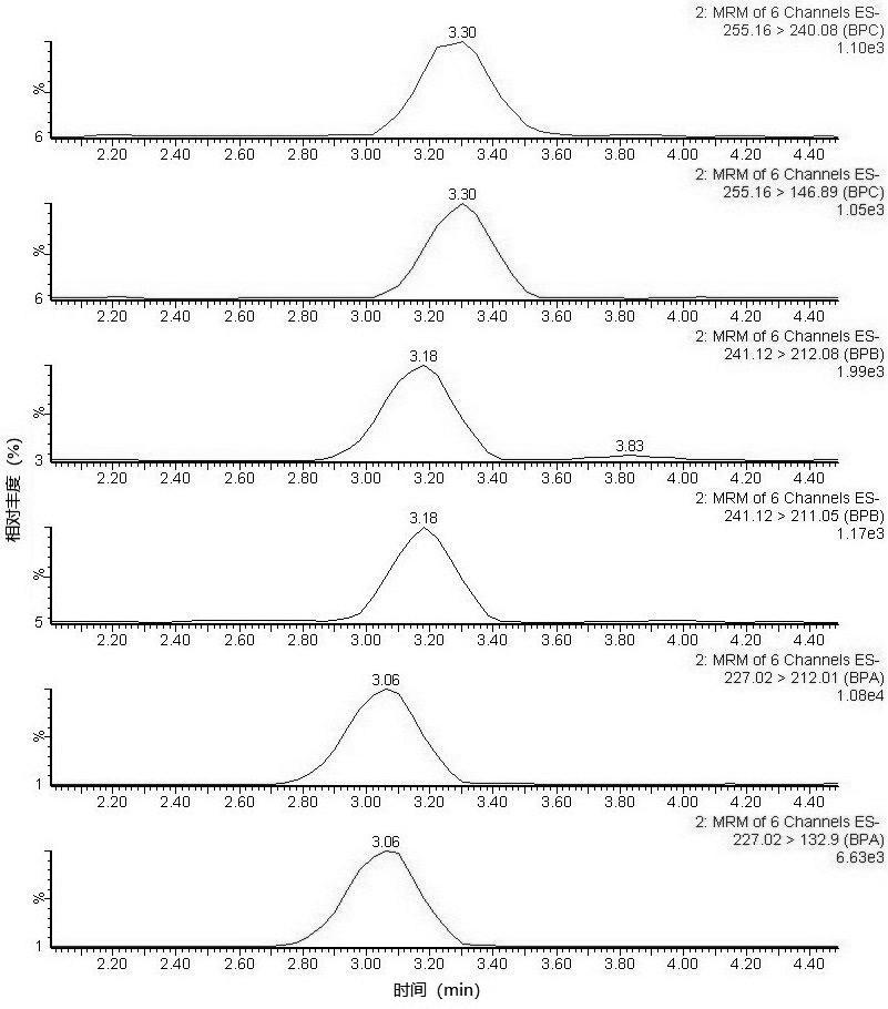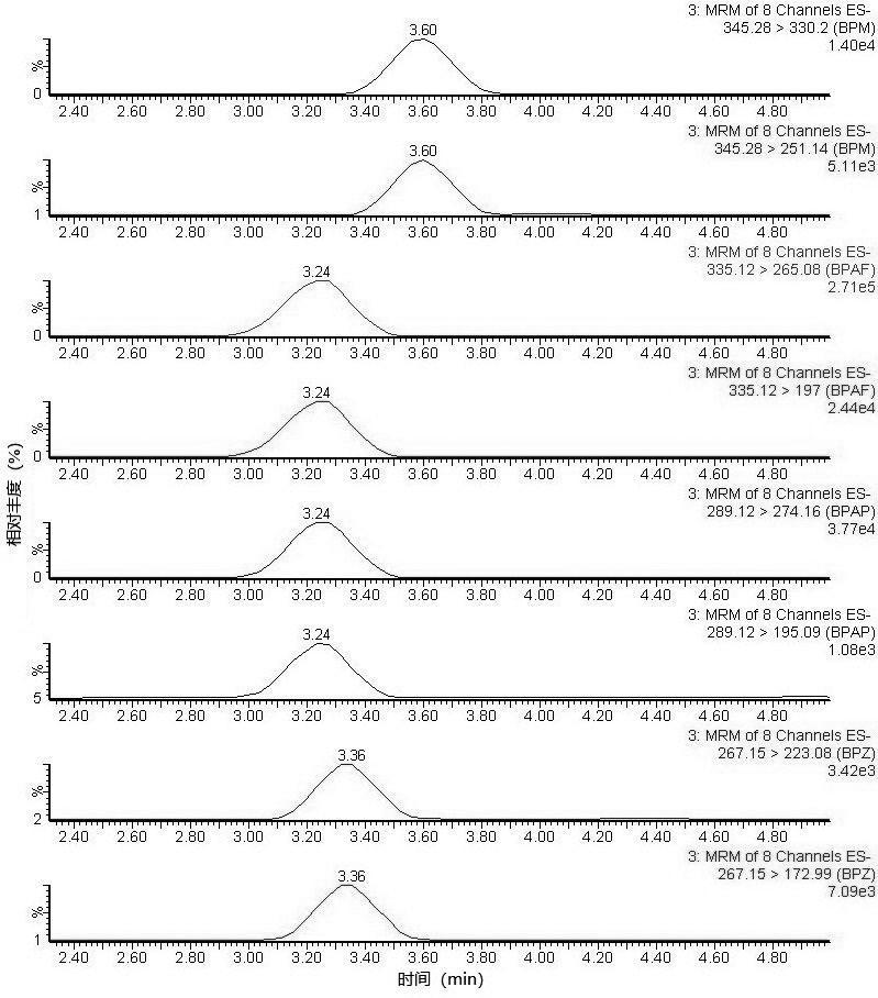甲醇、乙腈与丙酮(均为HPLC级),双酚A(BPA,CAS号136-36-7),双酚B(BPB,CAS号77-40-7),双酚C(BPC,CAS号79-97-0),双酚 E(BPE,CAS号2081-08-5),双酚S(BPS,CAS号80-09-1),双酚F(BPF ,CAS号620-92-8),双酚M(BPM,CAS号13595-25-0),双酚P(BPP,CAS号2167-51-3),双酚AP(BPAP,CAS号1571-75-1),双酚 AF(BPAF,CAS号1478-61-1),双酚Z(BPZ,CAS号843-55-0),四溴双酚 A(TBBPA,CAS号79-94-7(纯度均≥96%),以上均购自德国Dr. EHrenstorfer GmbH公司。