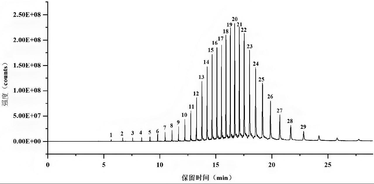 在相同的样品量和仪器条件下测试,未知样品的总离子流图如图8所示。由图8可见,图中产生的峰等保留时间间隔整齐排列,强度形成类似正态分布图形。通过各峰质谱图的碎片离子及相对丰度与标准谱库内化合物进行匹配。结果显示:图中序号为1—17的峰由中间1个强度较高的峰与两侧2个肩峰组成,中间强度较高的峰分别为壬烯至二十五烯,两侧的肩峰分别为对应碳数的二烯和烷烃;序号为18—29均为单峰,分别为二十六烯至三十七烯。通过上述表征结果及查阅相关资料,推测该未知样品可能为聚乙烯(Polyethylene,PE)树脂。