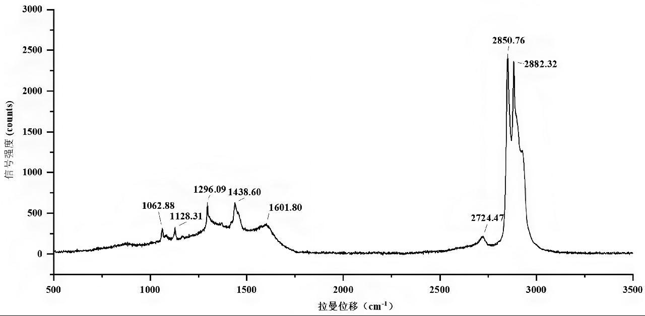 未知样品的拉曼光谱如图4所示,主要拉曼特征峰位于1063 cm-1、1128 cm-1、1296 cm-1、1438 cm-1、2724 cm-1、2851 cm-1、2882 cm-1处。其中,1063 cm-1和1128 cm-1处为C-C键伸缩振动,1296 cm-1和1438 cm-1处为C-H2弯曲振动[9,12]。饱和烃最显著的拉曼特征是2700~2970 cm-1范围内的强烈的拉曼效应,这段区域对应于C-H键的伸缩振动,其中包含了大量甲基和亚甲基的信息[4]。