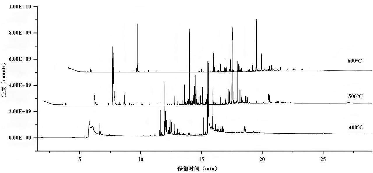 (1)裂解温度的优化。影响热裂解结果的主要试验条件为热裂解温度。分别设置400℃、 500℃和600℃作为热裂解温度进行试验,在不同裂解温度下EPS树脂的总离子流图(Total Ion Chromatogram,TIC)如图5所示。经对比发现,当裂解温度为400℃时,裂解产物较少,信号强度也较低;当裂解温度为500℃、600℃时,裂解产物基本一致,信号强度也增强了;当裂解温度为600℃时,产生的特征产物信号峰峰形更加对称和稳定。因此,试验选择600℃作为裂解温度。