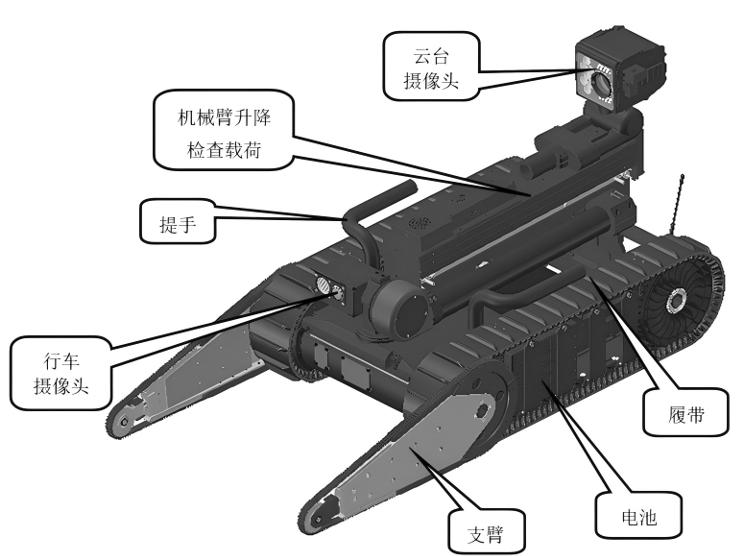 远程登临一体化查验机器人[9],该设备包含小型多功能底盘、机械臂升降检查载荷、操控箱控制器等。其中,小型多功能底盘和机械臂升降检查载荷装配组成了机器人本体,底盘为履带式带辅助臂底盘,机械臂升降检查载荷固定在底盘上。整机配备行进云台摄像头,辅助机器人行进和观察,图1所示的是机器人本体。