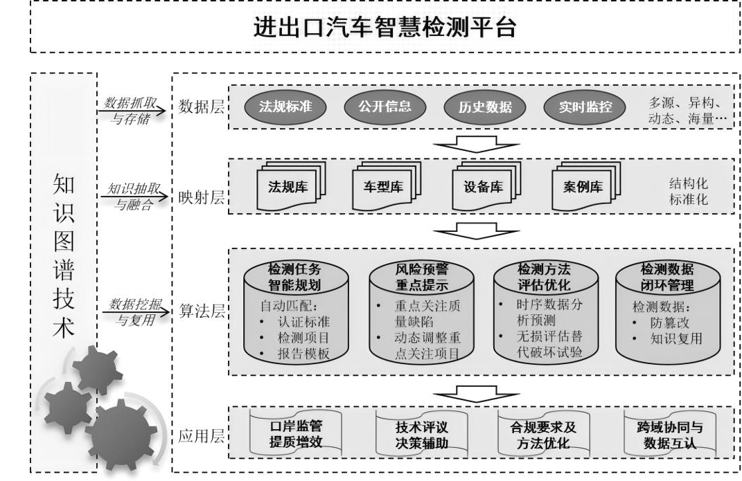 摘 要 本研究基于知识图谱技术,深度融合大数据分析、机器学习算法,构建面向口岸智慧监管的进出口汽车检测生态平台。通过对多模态异构数据的知识抽取与图谱构建,实现检测任务动态智能匹配与决策优化;借助时序数据分析模型与知识推理引擎,建立检测结果的智能校验体系,减少破坏性试验。该平台将海量历史检测数据转化为可复用的知识资产,支撑技术评议决策辅助、检测方法迭代优化、数据证书跨域互认、部门监管协同联动等多元应用场景,并通过典型应用场景进行验证。结果表明,本研究构建的智慧检测平台可显著提升检测效率,优化资源配置,能够为智慧口岸建设与汽车贸易数字化监管提供有效的技术解决方案。