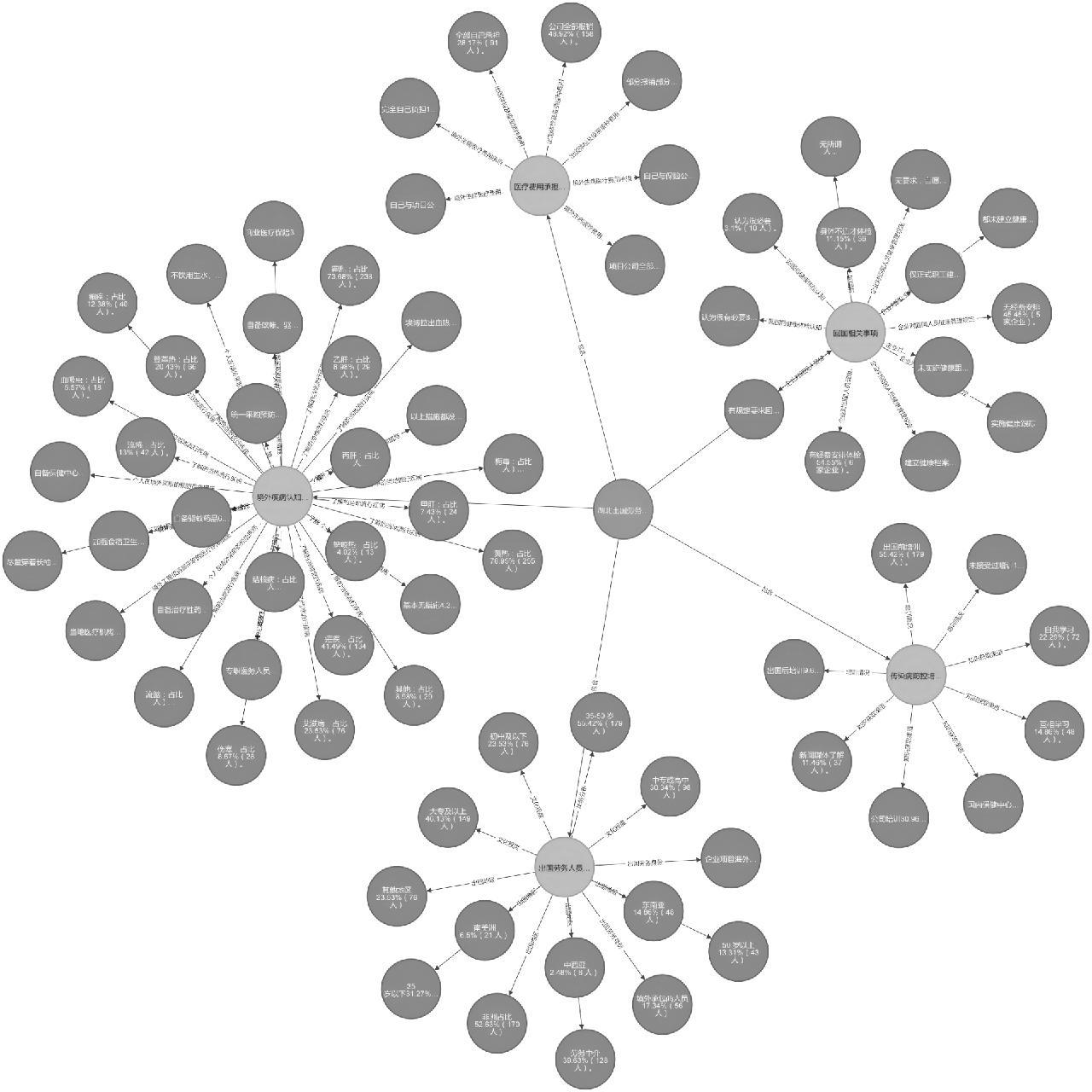 摘 要 本研究通过对2024年在湖北国际旅行卫生保健中心(武汉海关口岸门诊部)体检和预防接种的出境劳务人员随机发放调查问卷,利用知识图谱和问卷对传染病防控工作进行分析并提出有效建议。结果表明:出境劳务人员以青壮年男性为主,目的地多为非洲等传染病高发区。接受过企业组织培训的人员占比56.12%,未接受培训的人员占比12.84%,且培训内容覆盖不足;出境劳务人员体检和疫苗接种费由企业承担的占比48.66%,境外医疗费获企业保障的人员占比52.54%,但归国健康跟踪缺失,企业防控措施落实不到位。因此,应加强健康宣教、完善跨境医疗保障、建立归国人员健康监测体系、推动立法保障,构建多层次的防控网络。