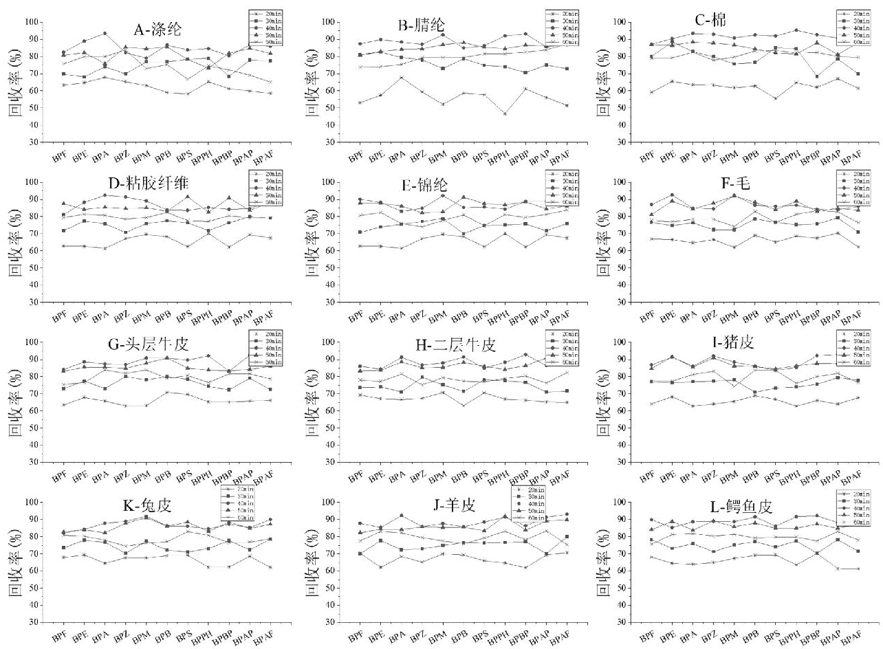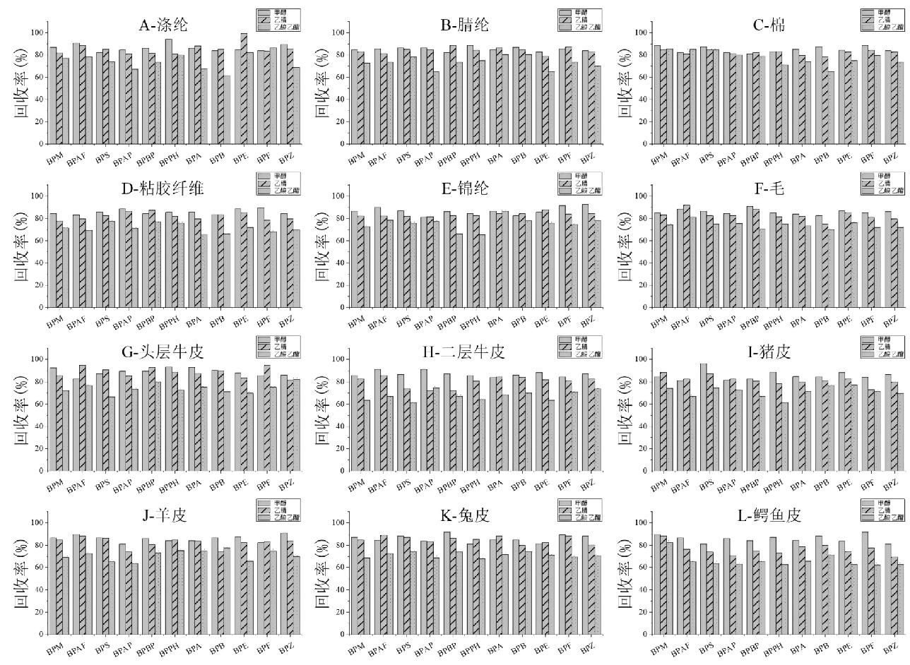 化合物 | 加标浓度(μg/L) | 涤纶贴衬 | 腈纶贴衬 | 棉贴衬 | 粘胶纤维贴衬 | 锦纶贴衬 | 毛贴衬 | |||||||||||