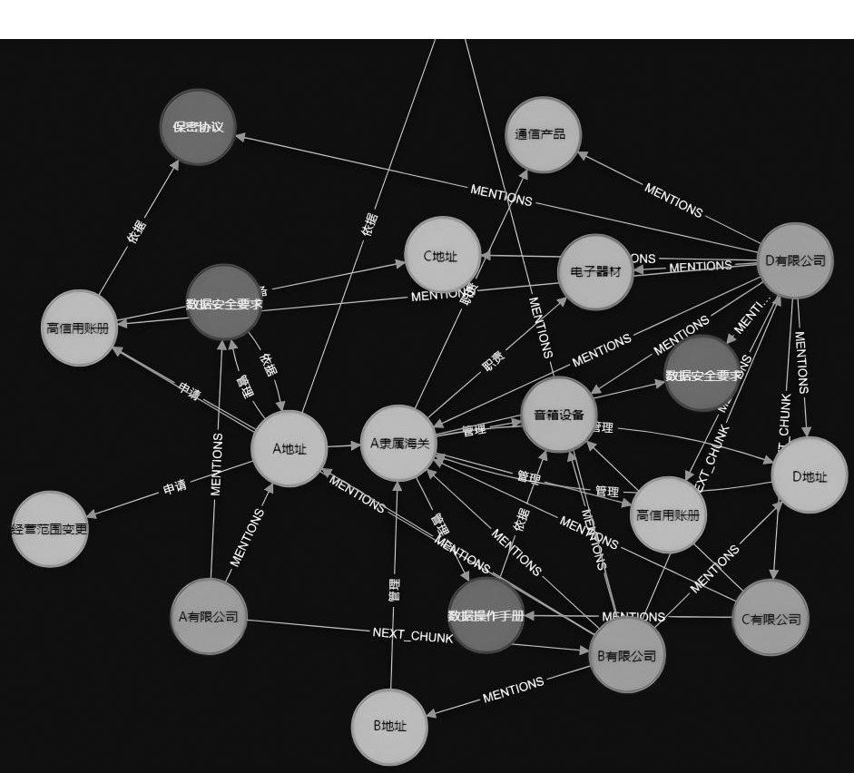采用Neo4j图数据库构建多层级知识网络,其中,企业节点(Enterprise)中属性包含注册地址、成立时间、行业分类等;商品节点(Commodity)中关联HS编码、商品描述、监管条件等。