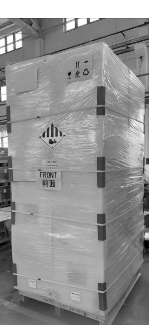超过3 m3的锂离子储能电池系统一般为柜式锂离子储能电池系统,因其外观尺寸、重量较大等原因,无合适的运输危包箱进行装箱和运输,因此应满足坚固、耐碰撞的外壳[9]。锂离子储能电池系统参照JT/T 1543—2025或GB 19432—2009 标准第7.3.1底部提升试验以及7.3.4跌落试验进行测试,测试时可用等重拟装物代替内部电池,测试后不产生影响运输安全的形变或破裂[10],证明其具有坚固、耐碰撞的外壳。此外,锂离子储能电池系统还应有坚固的外包装,或保护外罩,或其他搬运装置,如图8所示。