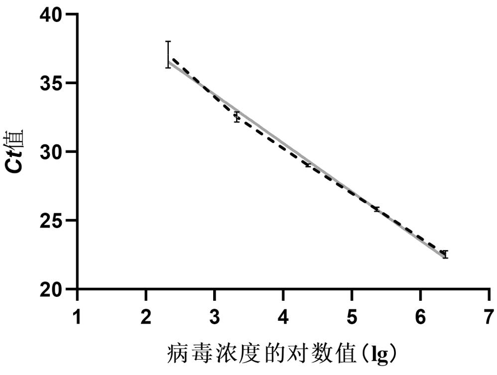 将制备的所有梯度标准品进行RT-qPCR检测,获得对应的Ct值,分析显示5个值具有良好线性关系,如图1所示。拟合的标准曲线公式为Y = -3.5365X+ 44.763(R = 0.9974)。