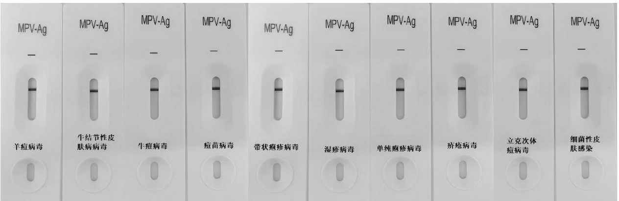 (1)用猴痘病毒抗原胶体金检测卡检测羊痘病毒、牛结节性皮肤病病毒、牛痘、痘苗病毒、带状疱疹、湿疹、单纯疱疹、疥疮、立克次体痘、细菌性皮肤感染、药物相关性皮疹等病原体阳性样本,结果均为阴性(图5),无交叉反应。