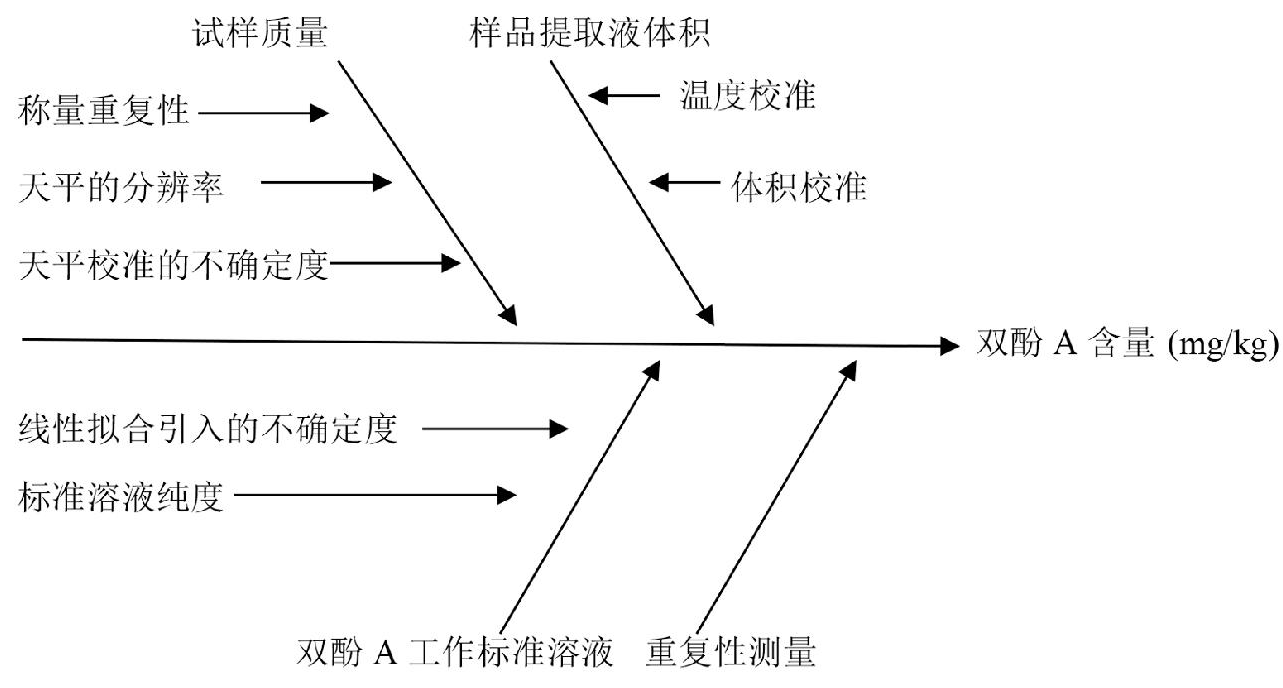为评定纸质包装材料中双酚A的不确定度,首先要明确试样中双酚A含量的测定结果的数学模型,并根据其数学模型对不确定来源进行分析。本试验中双酚A的数学模型如计算公式(1):