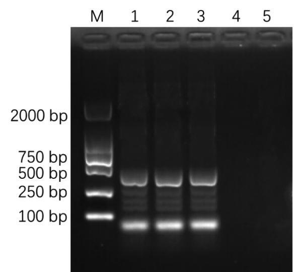 M: Marker DL2000; 1: NeLV阳性对照; 2: 朱顶红种球2401; 3: 朱顶红种球2401重复; 4: 阴性对照; 5: 空白对照
