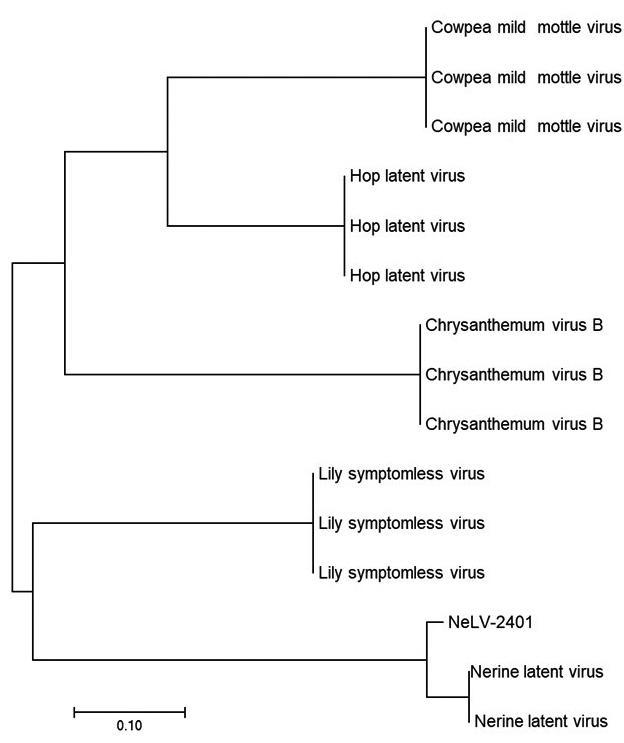 收集已发布的尼润潜隐病毒基因序列,以及同属的豇豆轻型斑驳病毒(Cowpea Mild Mottle Virus)、百合无症病毒(Lily Symptomless Virus)、啤酒花潜隐病毒(Hop Latent Virus)、菊B病毒(Chrysanthemum Virus B),与NeLV-2401的基因序列进行同源性分析,构建系统发育树(图5),基因序列变化强度表现为进化树的分支长度。由构建的系统发育树可以看出,所收集的病毒序列聚为2个大支,NeLV与百合无症病毒亲缘关系较近,聚为1个大支,与其他同属病毒种类距离较远,NeLV-2401与韩国株系、荷兰株系关系最近,聚为1个小分支,进化分析表明NeLV-2401为尼润潜隐病毒。