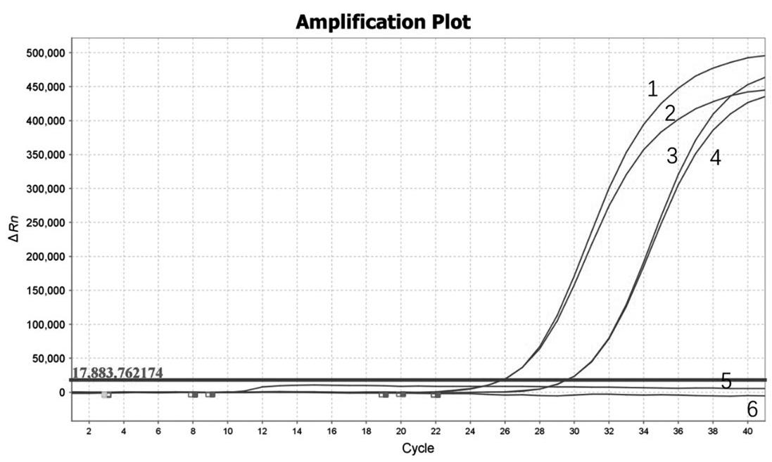 反应程序为:50℃保温10 min,95℃预变性5 min;95℃变性10 s,60℃延伸30 s,共40个循环。用荧光定量PCR仪自带软件对结果进行分析判断,根据阴性对照数值设定检测阈值线,扩增曲线及样品Ct值经软件分析自动生成。