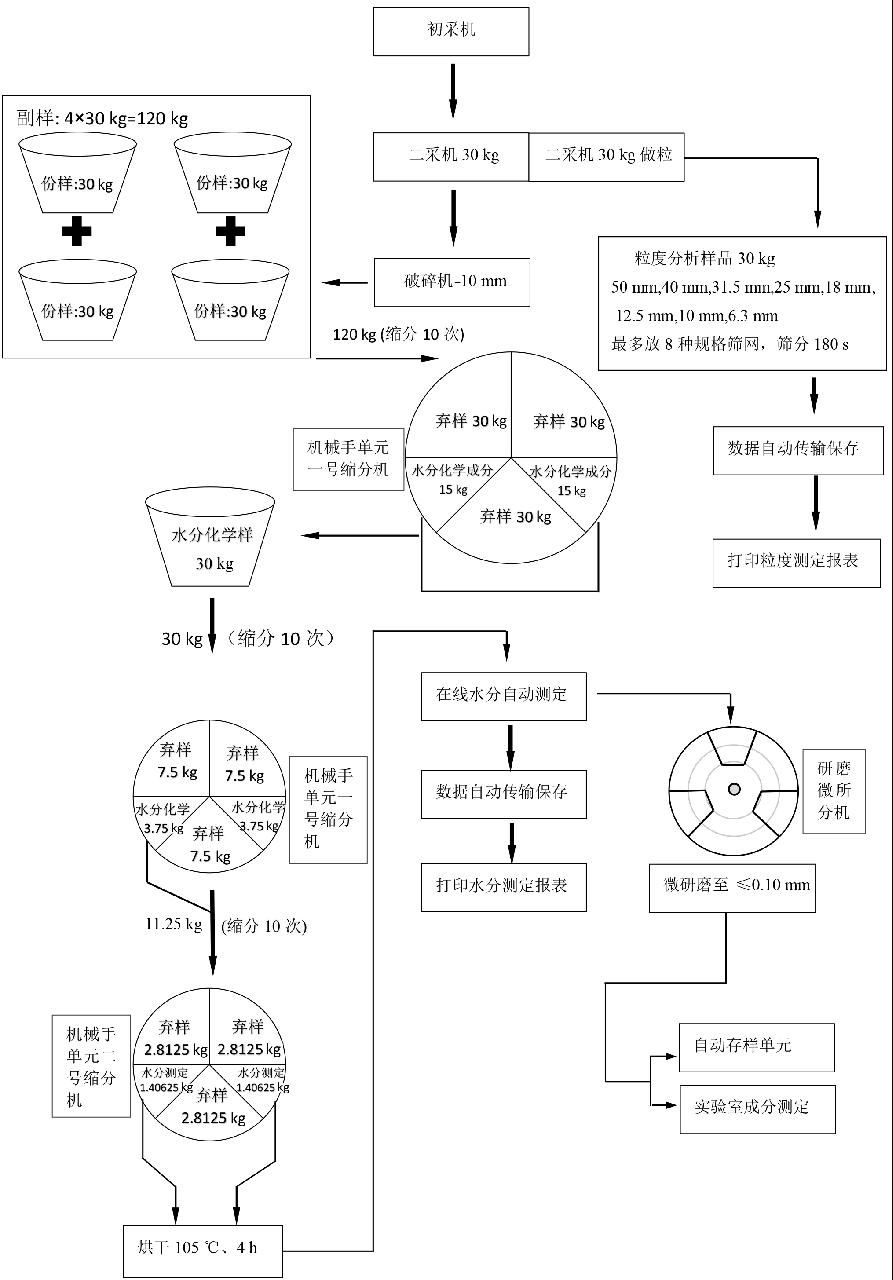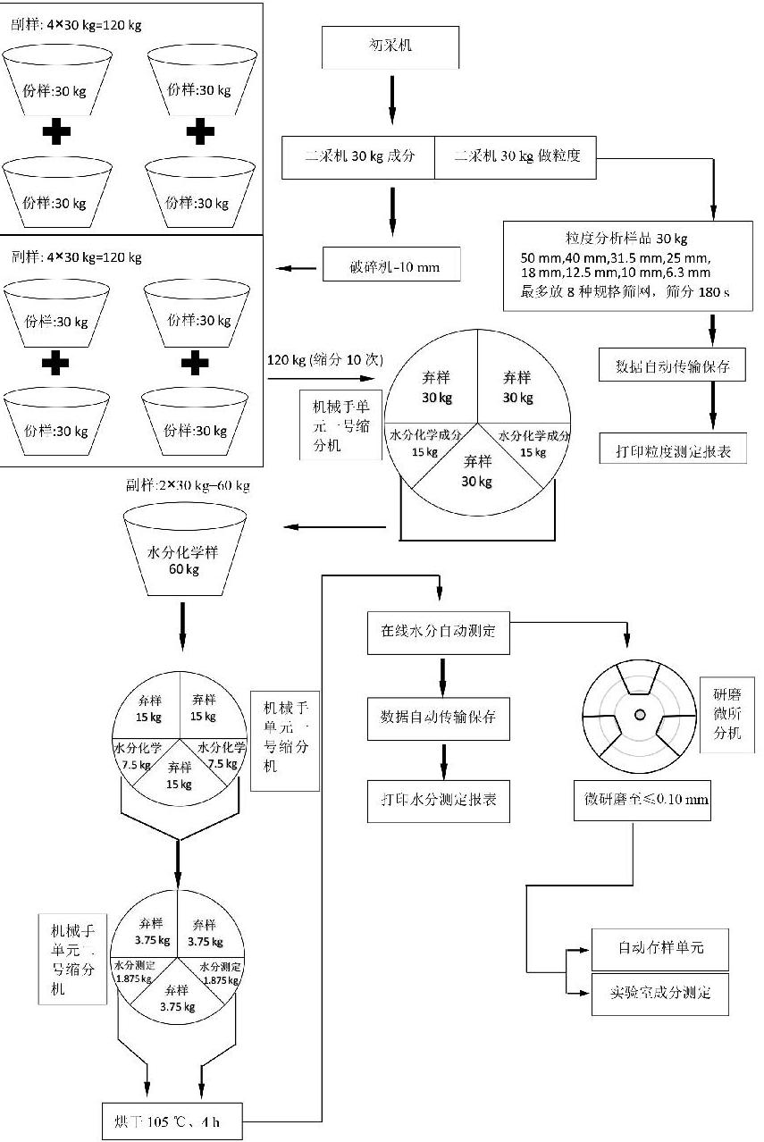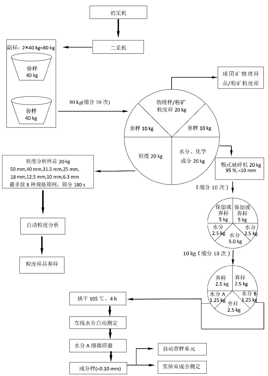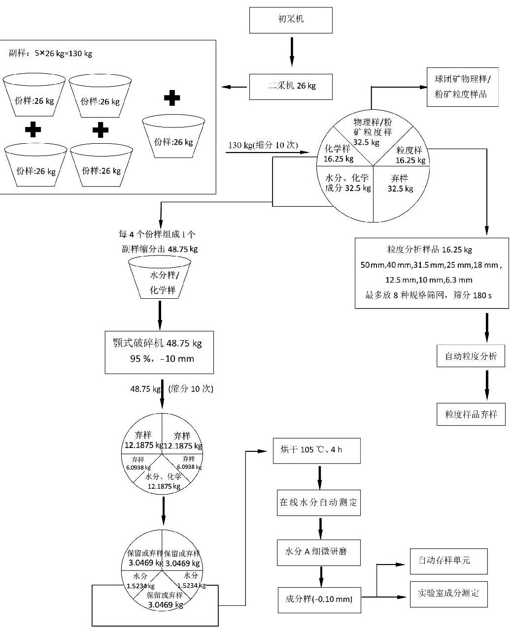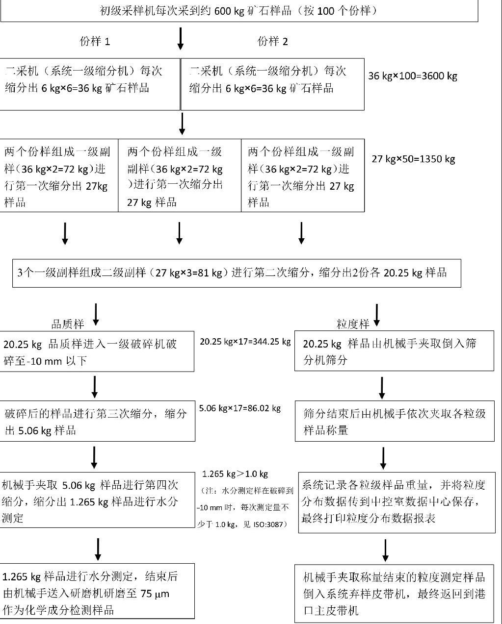 接着再由6个份样组成1个副样缩分得到粒度测定样、水分测定样和成分样进行完整的工艺流程,根据国内已经建成的铁矿石散货码头采制样检测系统工艺和工艺量,流程如下:
