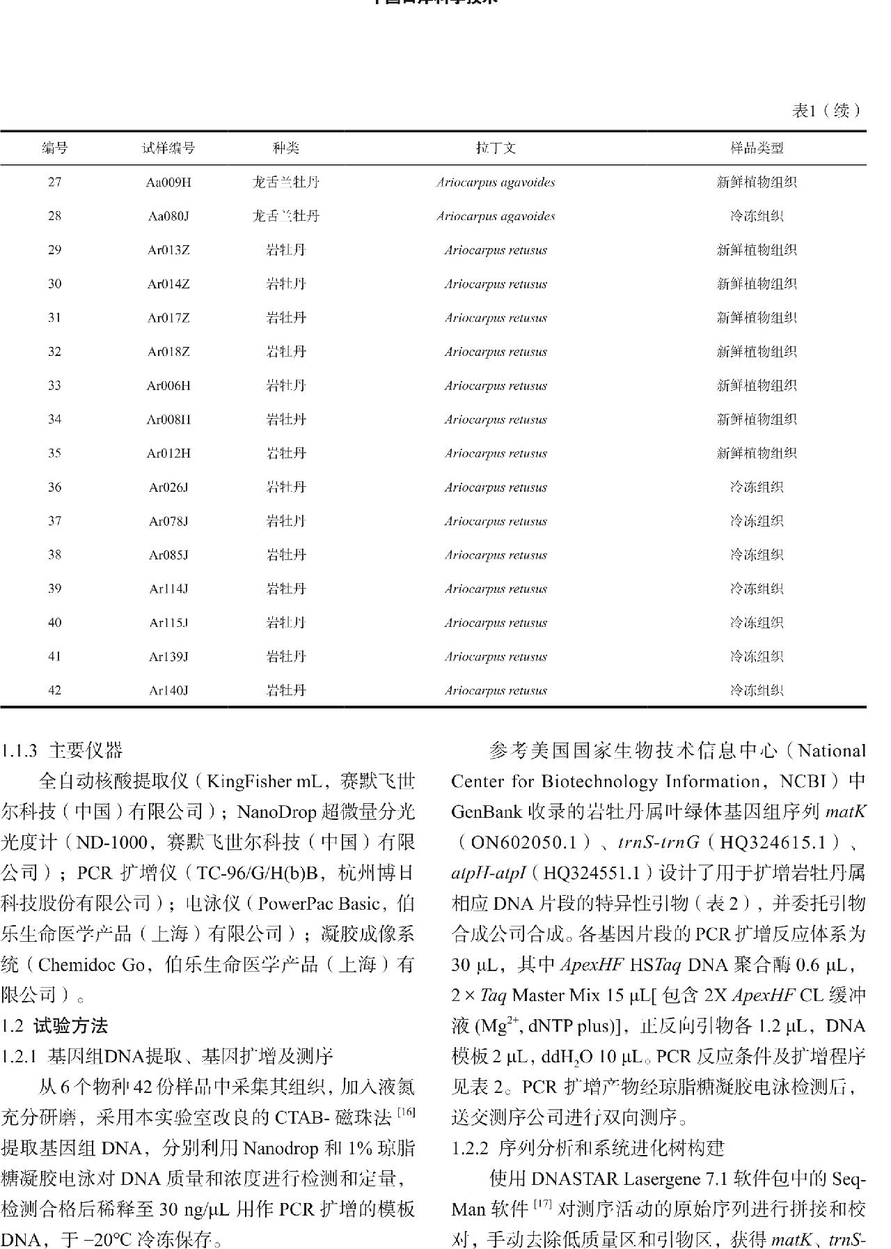 本研究收集了岩牡丹属不同来源个体,共6个物种42份样品(表1),全部由拱北海关在口岸查获。其中,勃氏牡丹(A. bravoanus)6个、黑牡丹(A. kotschoubeyanus)7个、龙角牡丹(A. scaphirostrus)4个、龟甲牡丹(A. fissuratus)6个、龙舌兰牡丹(A. agavoides)5个、岩牡丹(A. retusus)14个。样品均由相关专家复核鉴定,并采集新鲜植物组织或留存冷冻组织进行后续试验。试验材料具体信息见表1。