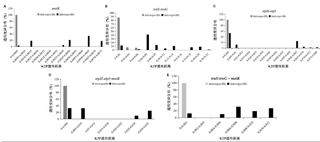 A: matK序列; B: trnS-trnG序列; C: atpH-atpI序列; D: atpH-atpI+matK序列; E: trnS-trnG+matK序列