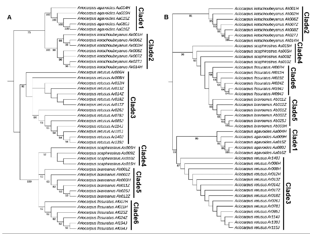 Fig.3 Neighbor-joining (NJ) phylogenetic tree of Ariocarpus species based on combined chloroplast DNA sequences
