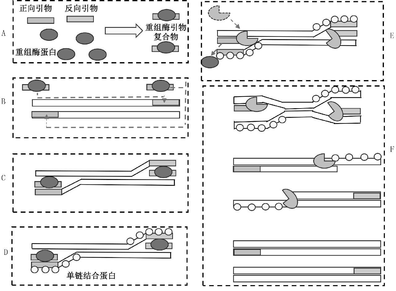 A: 重组酶—引物复合体的形成; B: 定位模板上的同源序列; C: 引发链置换反应形成D环结构; D: 单链结合蛋白稳定被置换的DNA链; E: DNA聚合酶识别重组酶解离后暴露出的引物3 '端; F: DNA扩增