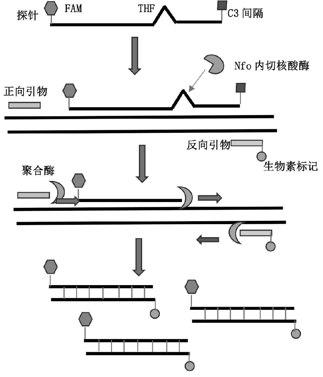 使用RPA-LFD检测时,反应体系中需加入核酸内切酶Ⅳ(Endonuclease Ⅳ,nfo)、nfo探针和3'带有生物素标记的反向引物。nfo探针5'端带有FAM荧光报告基团标记,中间有THF碱基间隔,3'末端有C3阻隔基团。探针结合时,THF位点被核酸外切酶Ⅳ识别并剪切,产生3'端聚合酶结合位点,启动链的延伸,形成的扩增产物包含FAM标记和生物素标记,可使用包被有抗生物素抗体和抗FAM抗体的硝酸纤维素膜观察检测。方法的原理如图3所示[17]。