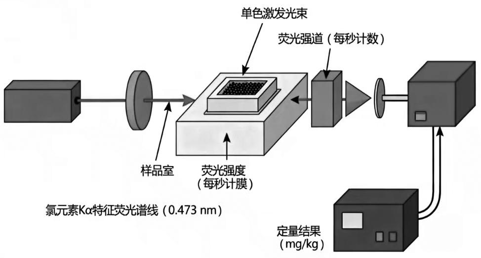 单波长色散X射线荧光光谱仪的工作原理,是利用X射线源产生的X射线经过入射光单色器分光后形成单色激发光束,该特定波长的X射线能够激发样品中氯元素的K层电子[13]。当样品受到激发后,氯元素会发射出特征波长为0.473 nm的Kα荧光谱线,该荧光信号被固定通道单色器收集并聚焦到探测器上[3]。通过测量该特征波长下的X射线荧光强度(以每秒计数表示),并建立荧光强度与氯浓度之间的校准曲线,即可实现样品中有机氯含量的定量分析(单位为mg/kg)[10]。该仪器系统主要由X射线发生器、入射光单色装置、固定道单色器、样品室(含样品盒和样品膜)、信号检测器以及控制单元等核心部件构成[14-17]。其工作原理示意图如图1所示。