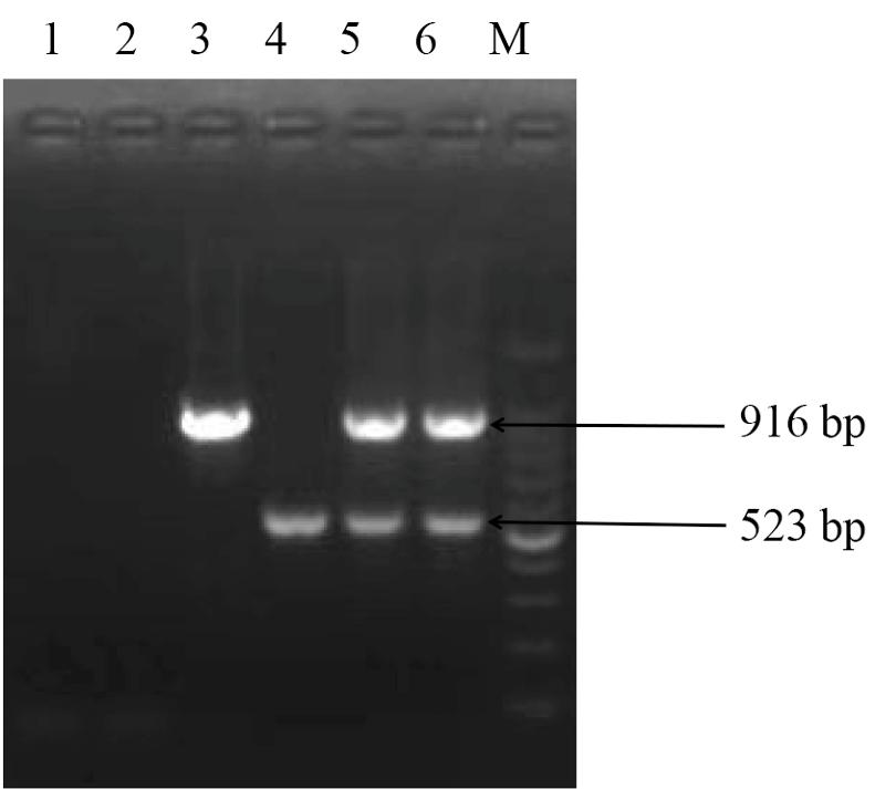 Fig.3 Duplex PCR amplification results of ORFV and CaPV