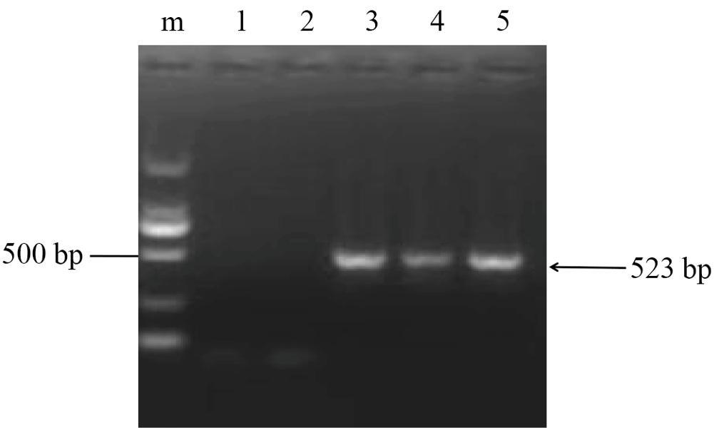 经对PCR反应过程中的引物浓度、退火温度和时间等条件的优化,从扩增的特异性和扩增效率方面考虑选择最佳反应条件,确定最终反应条件:2×Taq PCR Mix 12.5 μL,上、下引物C1和C2浓度为5 μM/L 各1 μL,核酸模板5 μL,去离子水补足至25 μL;PCR循环参数为:94℃ 预变性2 min,95℃ 30 s,56℃ 或58℃ 30s,72℃ 20 s,40个循环后,72℃延伸5 min。反应产物扩增出特异性条带523 bp,与预期结果相符(图2)。
