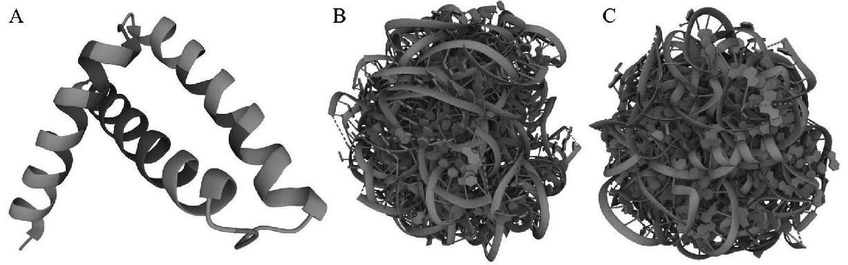 A: NS1的1~73位氨基酸三级结构; B: 流感病毒NP基因组RNA三级结构; C: NS1的1~73位氨基酸和流感病毒NP基因组RNA三级结构相互作用