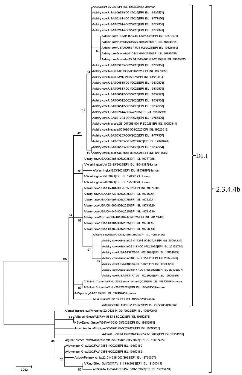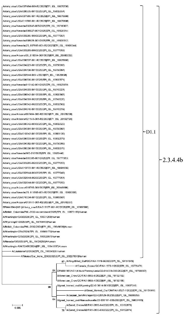 D1.1基因型是H5N1亚型禽流感病毒2.3.4.4b进化分支的一种新的基因型,全球流感数据共享倡议组织数据库(Global Initiative on Sharing All Influenza Data,GISAID)收录的最早的人感染D1.1基因型禽流感病毒是2024年10月,2025年1月在奶牛中首次发现D1.1基因型禽流感病毒[7]。D1.1基因型禽流感病毒可能对哺乳动物的适应性高于2.3.4.4b进化分支其它基因型。截至2025年11月6日,D1.1基因型禽流感病毒已在美国、加拿大等地区的奶牛和人病例中检出,并成为北美迁徙野鸟中的主要毒株之一。