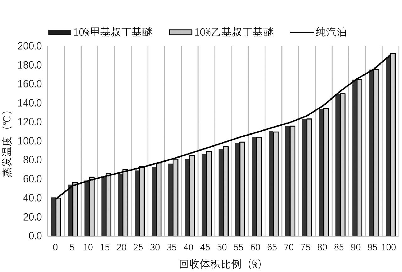 甲基叔丁基醚(Methyl Tert-butyl Ether,MTBE)和乙基叔丁基醚(Ethyl Tert-butyl Ether,ETBE)作为含氧的化合物,与汽油能够很好地混合,因此在汽油添加剂领域得到了广泛应用。它们的主要作用是提升燃料的辛烷值,增强发动机的燃烧效率及抗爆性能,同时有助于减少一氧化碳、氮氧化物以及特定颗粒物等有害物质的排放。在我国,甲基叔丁基醚是主要的选用品种,而在发达国家,乙基叔丁基醚则更为普遍。图5显示添加剂对蒸馏曲线影响较小。