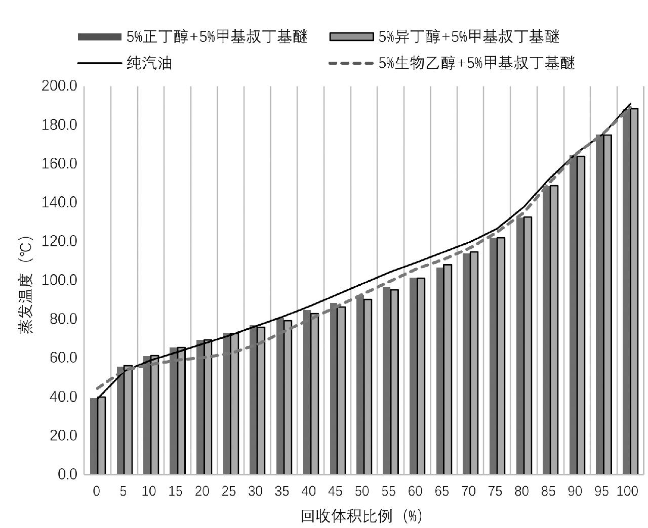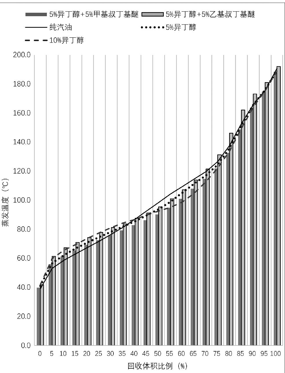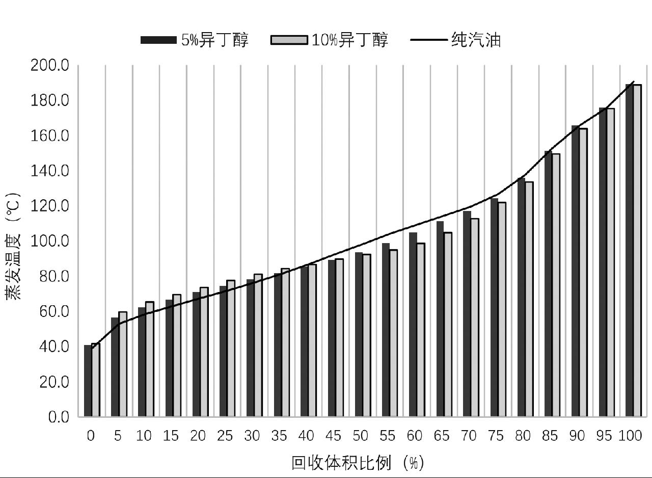 图3 生物丁醇(异丁醇)汽油的蒸馏曲线