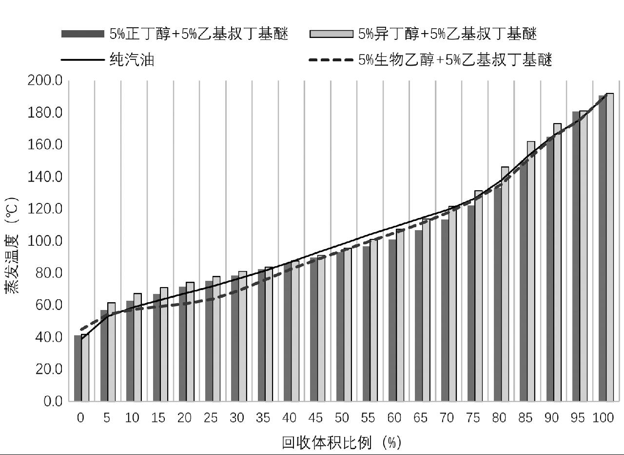 在同时加入5%生物乙醇和5%叔丁基醚的情况下,这些含氧化合物对改变蒸馏曲线的影响是重叠的,而相比10%生物乙醇,5%生物乙醇+5%叔丁基醚的混合汽油的蒸馏曲线更接近汽油[15],如图6所示。