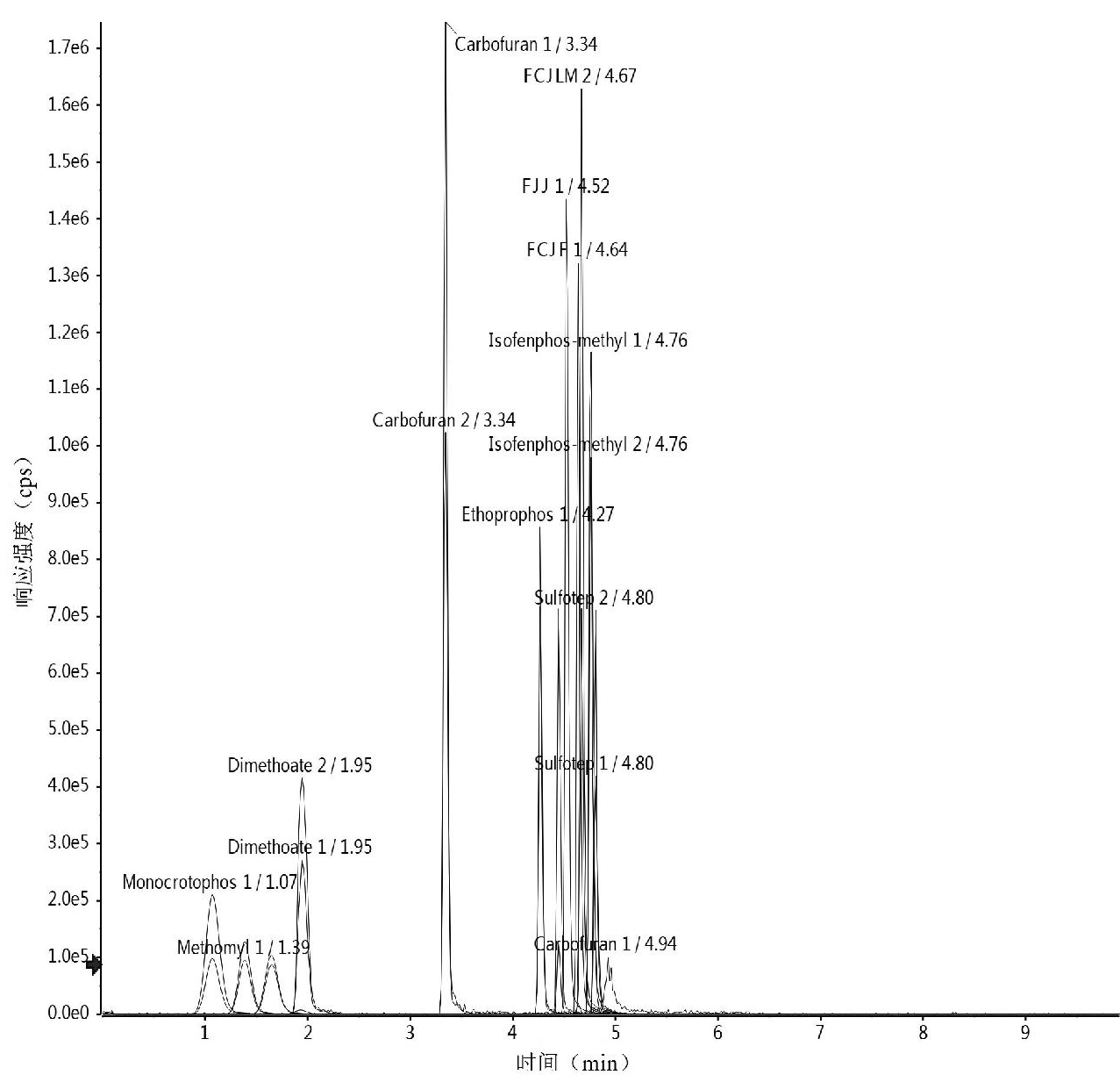 乙腈(色谱纯,广州化学试剂厂);盐包(珠海杰燊生物科技有限公司);净化管(珠海杰燊生物科技有限公司);标准品:克百威、3-羟基克百威、乐果、灭线磷、氯唑磷、甲基异柳磷、灭多威、久效磷、治螟磷、氟虫腈、氟甲腈、氟虫腈砜、氟虫腈亚砜、莠去津-D5(纯度>98%,德国 Dr. Ehrenstorfer 公司)。