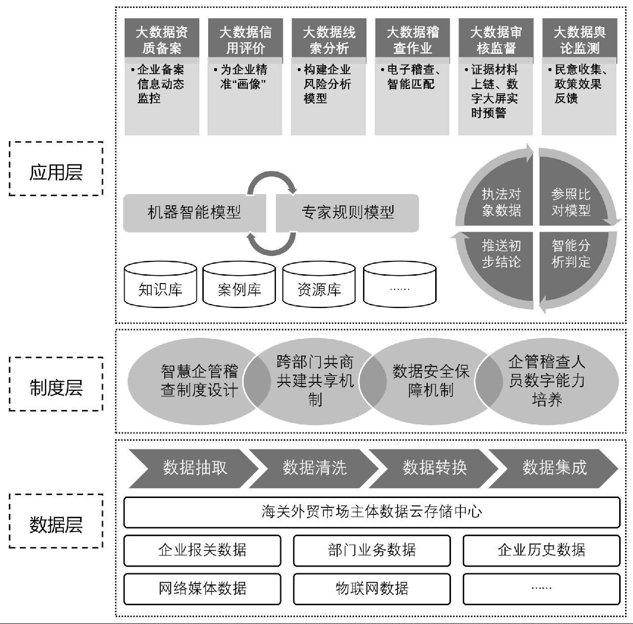 大数据驱动的“智慧企管稽查”,是基于大数据技术的智能监管体系,以数据资源为核心要素,运用算法计算作为技术支撑,通过信息化平台实现精准执法目标。该体系构建在信息对称基础上,具有开放性和动态适应性特征。该系统融合物联网感知、云计算处理、大数据分析及移动互联等前沿技术,对具备海量性(Volume)、多源性(Variety)、时效性(Velocity)和价值稀疏性(Value)特征的数据资源进行多源实时采集、智能解析与可视化呈现,实现对跨境贸易主体的全流程监管,精准识别涉法风险指标,智能筛选重点监管对象,高效查处违规违法行为。“智慧企管稽查”体系基本架构如图1所示。