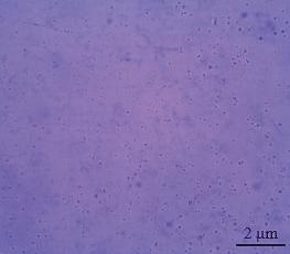 经过液体和固体培养基上连续2次分离培养,从患病奶牛乳汁中获得一株甾原体纯培养物,命名为WQ001。WQ001纯化菌落在显微镜100×视野下呈现典型的“煎蛋样”菌落,核心较厚,有棕黄色中心突起,边缘为一层薄薄的透明区(图1)。莱氏无胆甾原体革兰氏染色时均不易着色(图2);用吉姆萨染色法着色良好,显微镜下观察呈蓝紫色,形态特征为小球状,其直径为200~400 nm,如图3所示。