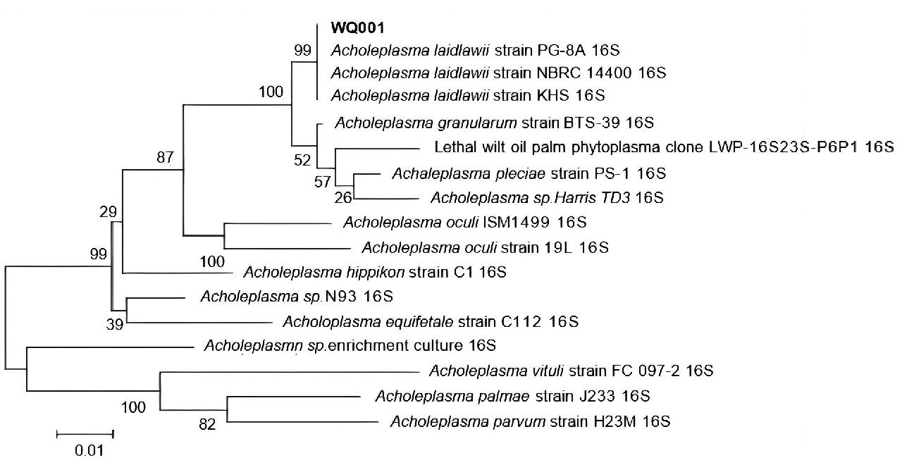 用16S rRNA引物从WQ001株基因组中扩增得到1413 bp片段,经BLAST比对发现该分离株与莱氏无胆甾原体PG-8A株(登录号:NR_074448.1)的16S基因片段相似性最高,达99.0%,与 pleciae无胆甾原体相似性达98%,与颗粒无胆甾原体和油棕植原体的相似性为97%,采用MEGA5.0软件,用N.J法建立系统发育树。该分离株与莱氏无胆甾原体PG-8A株聚在同一分枝上(图4)。