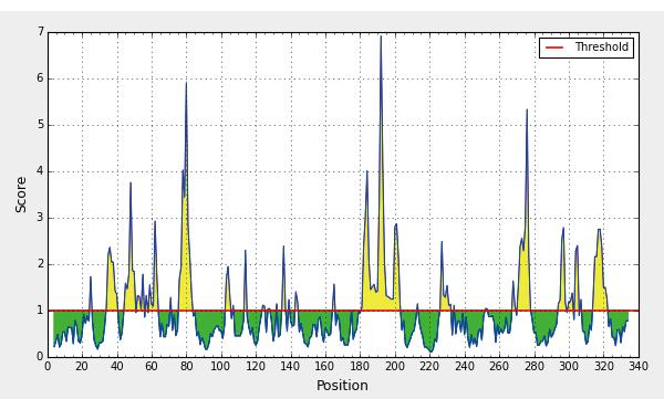 (2)Gap蛋白二级结和抗原表位预测。预测Gap蛋白多肽链二级结构的3种类型分别是α-螺旋、β-折叠和无规则卷曲,比例分别是26.41%、 24.33%和49.26%,以无规则卷曲为主,β-折叠较少;而其溶剂可及性分别是暴露31.75%、埋藏60.83%以及中间7.42%,因此,Gap氨基酸残基主要是埋藏的,提示其具有疏水性。分析Gap蛋白的三级结构可知,其主要以无规则卷曲和转角散在存在,充分与周围的极性环境相接触,为抗原表位的形成提供有利条件(图17)共有12个表面可及性程度高的肽段,其中有9个肽段的表面可及性程度最高;22个具有抗原性的肽段,且抗原性的强弱不同,其中有10个肽段的抗原性最强;21条线性B细胞表位,其中1号、4号、5号、6号、8号、9号、10号、12号、14号、15号、16号,17号、19号、20号和21号肽段的氨基酸均小于7个,不符合B细胞表位的要求(图18)。综合上述预测结果,最终确定Gap蛋白的B细胞表位,说明,WQ001株的Gap蛋白优势抗原表位结构并不多,预测其抗原性不明显。
