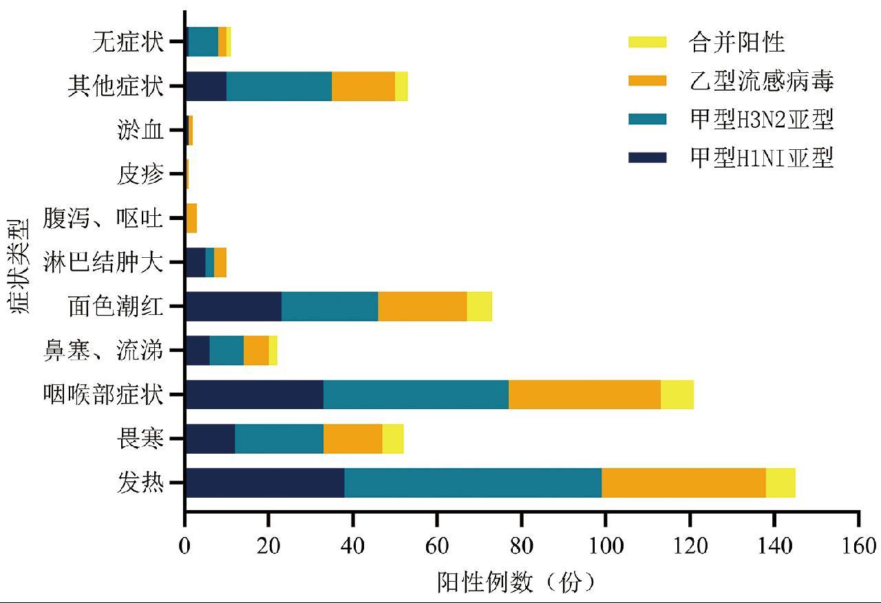 发热、咳嗽、咽痛、咽喉部红肿、面色潮红、身体不适、乏力、盗汗等为主的感冒常见症状以及畏寒等症状是各类流感病毒阳性病例主要的症状类型,其中,发热症状在阳性样本中占78.80%,咽喉部红肿占65.76%,面色潮红占39.67%,其他感冒常见症状占28.80%。除上述症状外,部分病例偶发淋巴结肿大(5.43%)和腹泻、呕吐(1.63%)等症状。合并阳性的12例中,咽喉部症状8例,发热7例,面色潮红为6例,畏寒为5例,鼻塞流涕2例。各症状间差异无统计学意义(χ2 = 24.714,P = 0.727),见表3和图3。