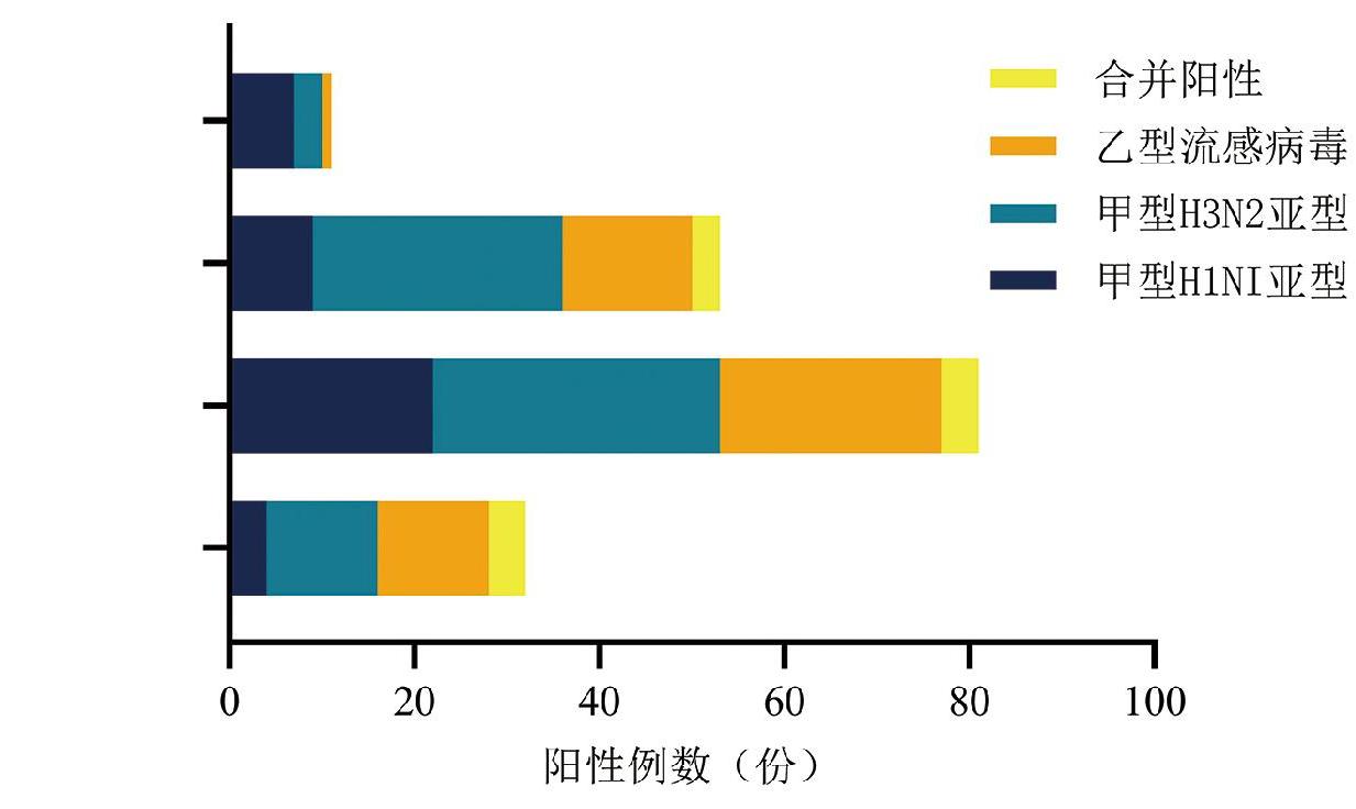 项目 | 阳性数 (份) | 占比 (%) | 甲型H1N1亚型感染病例 (例) | 甲型H3N2亚型感染病例 (例) | 感染病例 (例) | 感染病例 (例) | χ2值 | P值 | |