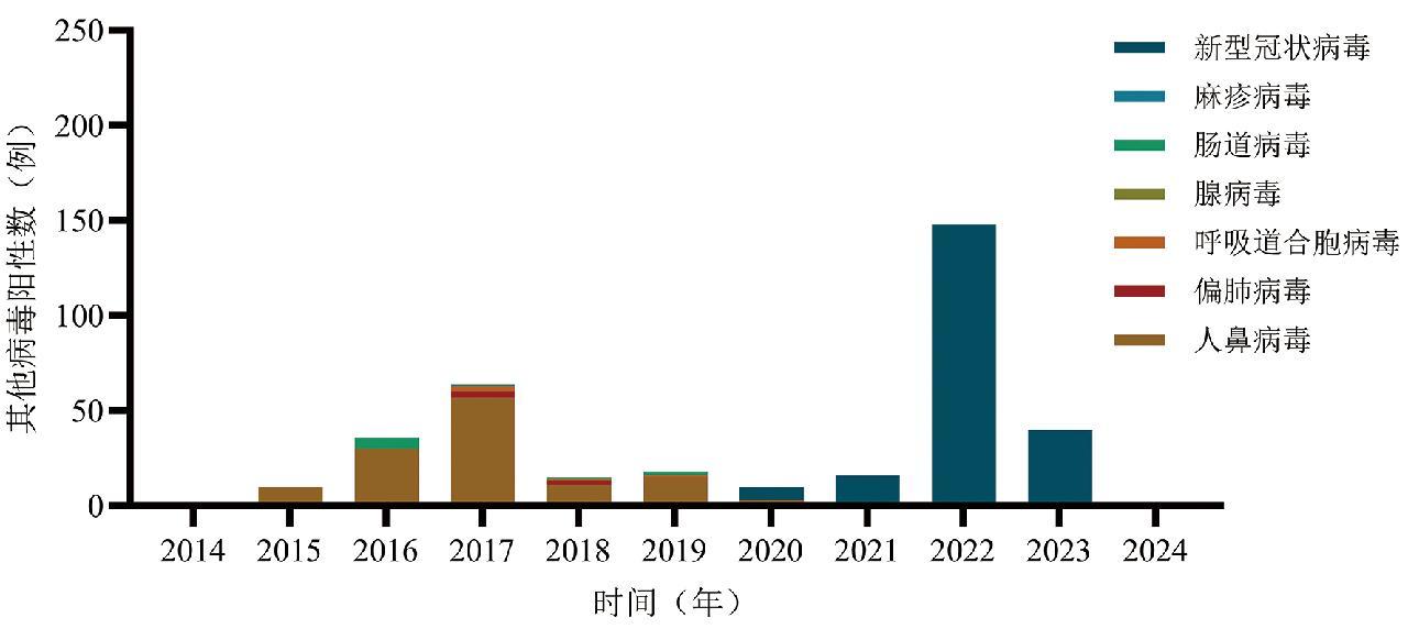 图5 2014—2024年吉林口岸其他病毒阳性病例年份分布