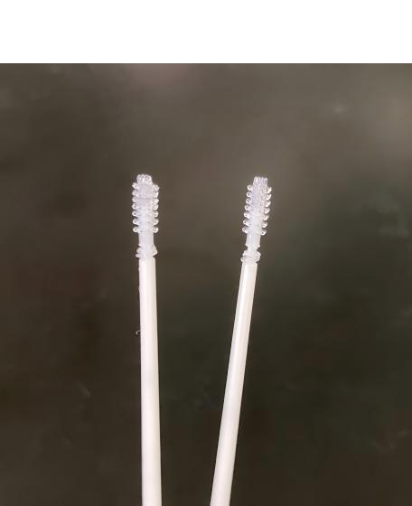 检测猴痘病毒时取患者50 μL 血液样品或拭子溶液加入微流控芯片样品通道进行检测。现场检测用3D打印拭子(图3)擦拭患者疱疹液,将拭子端部折断放进样品通道进行检测,如果是组织样品取1~2 g加入搓揉管中(图4),用手反复搓揉10~20 s后加入2滴溶液于样品通道,将芯片插入一体化实时荧光PCR检测仪内,运行反应35 min即可直接读取结果。