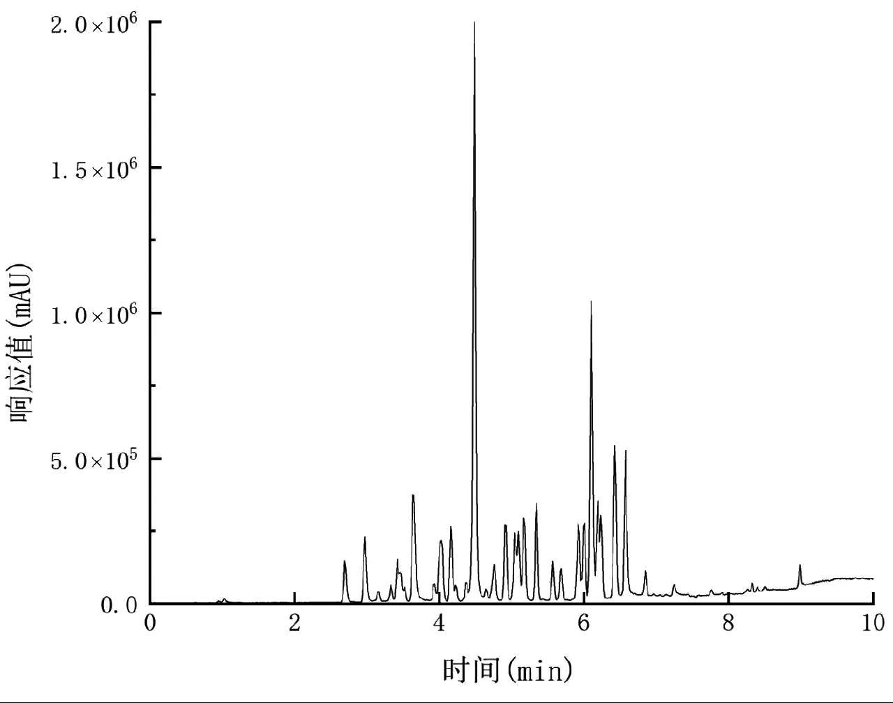 本研究选用SynergiTM Fusion-RP 80 A(50 mm×2 mm,4 μm)、Kinetex F5(100 mm×3.0 mm,2.6 μm)、Venusil MP C18(2.1 mm×100 mm,3 µm) 3种不同规格的色谱柱进行51种目标化合物分离度和峰形的考察,发现选用Kinetex F5(100 mm×3.0 mm,2.6 μm)时,51种化合物能快速出峰且峰型较好,并能实现较好的分离,化合物灵敏度高,全部出峰仅需10 min,如图1所示。