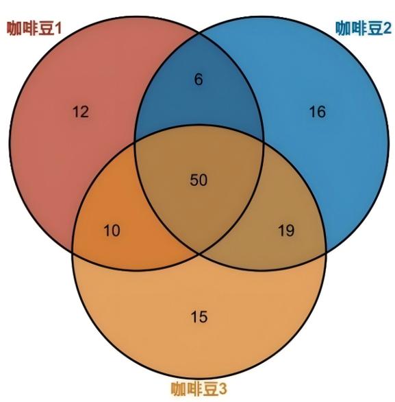 Fig.4 Venn diagrams of the odor components of 3 coffee bean samples
