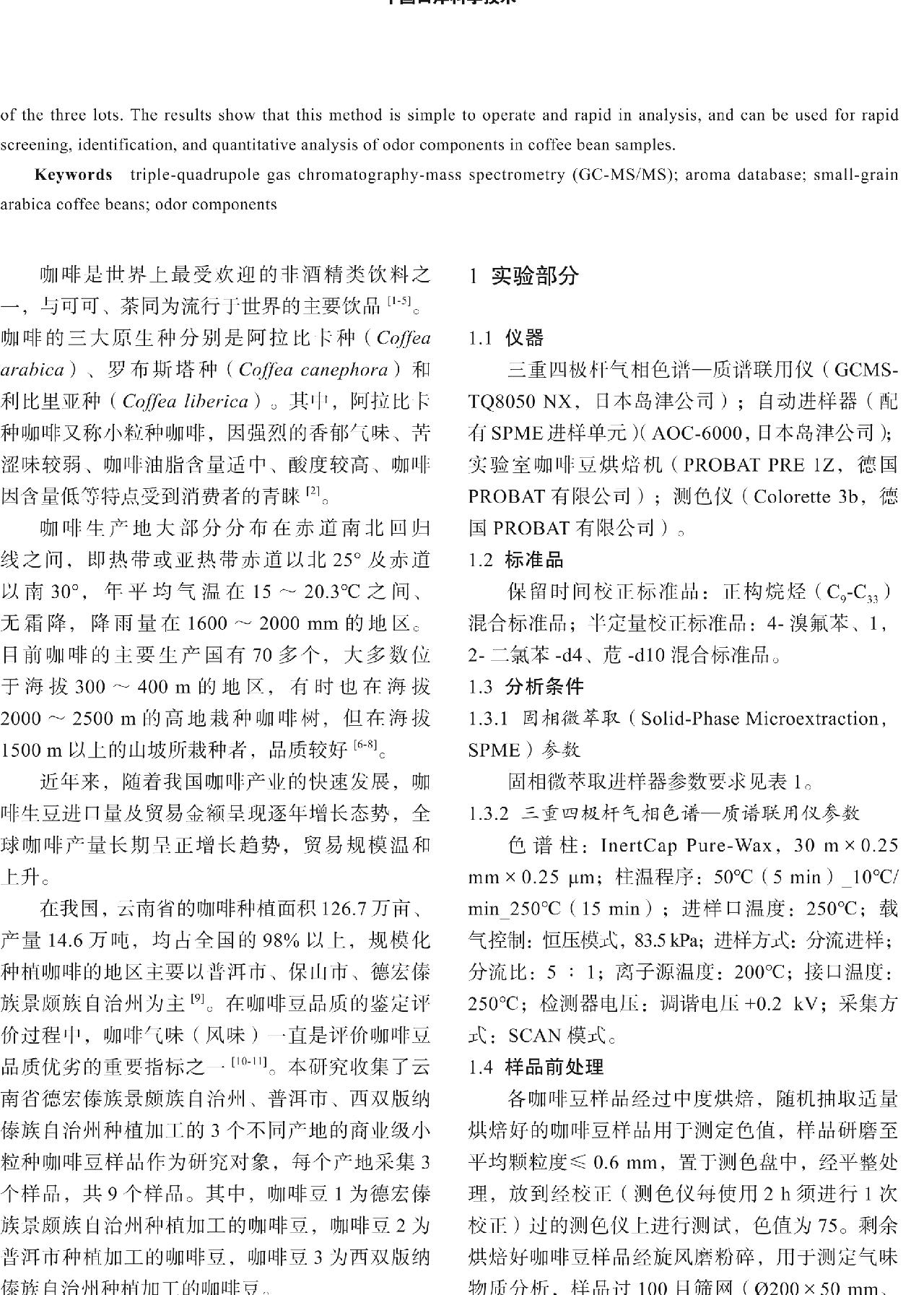 关键词 三重四极杆气质联用仪;香味数据库;小粒种咖啡豆;气味成分