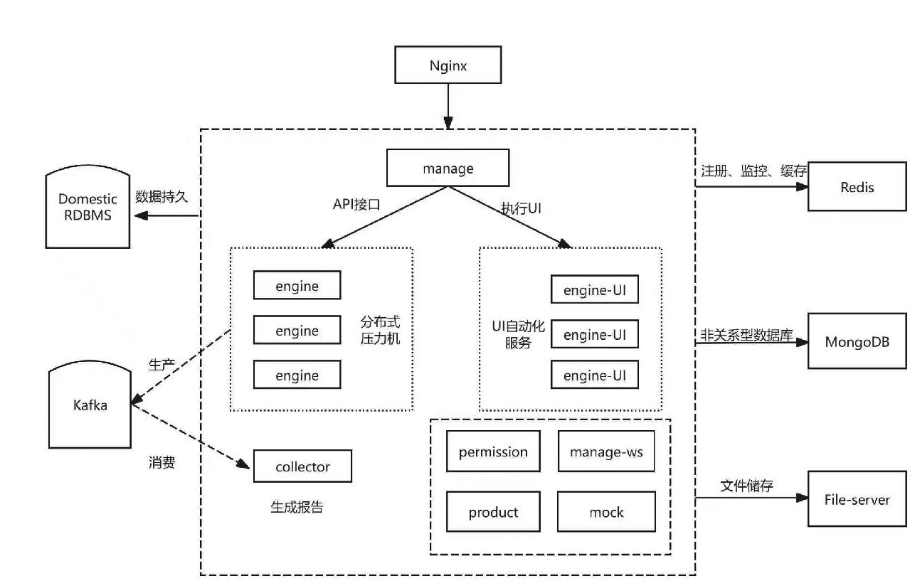 本方案基于深圳海关建设的一站式自动化测试平台,采用前后端分离架构,前端使用React.js构建交互式管理界面;后端依据场景精准选型,高并发核心服务以Golang实现,确保微秒级响应;复杂业务逻辑采用Python,提升开发效率。在微服务化的核心业务层,系统拆分为管理服务、项目管理、权限服务等多个独立模块,通过RESTful API与WebSocket提供标准化与实时性的服务接口,实现了业务的高内聚、低耦合与独立部署伸缩。为进一步支撑自动化测试等高负载任务,该系统设计了engine分布式执行引擎层,将接口压测引擎与UI自动化引擎分离,两者均可根据任务量动态调度资源,实现弹性伸缩。所有数据由统一存储与处理平台支持:达梦存储核心关系数据,Redis提供高速缓存,MongoDB处理非结构化文档,Kafka管理实时消息流,并通过独立的Collector服务进行全链路性能数据的采集与聚合,从而构建了一个层次清晰、各司其职、能够灵活响应业务变化与技术挑战的现代化应用架构体系。