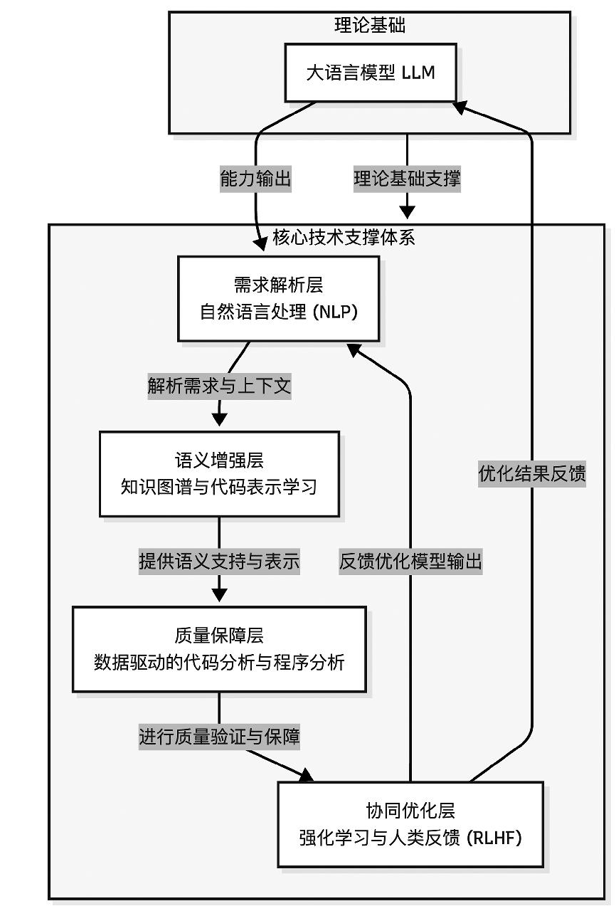 AI辅助编码的核心技术体系以LLM为理论基础,通过需求解析、语义增强、质量保障和协同优化等关键环节,构建从需求理解到结果反馈的闭环支撑结构,如图2所示。