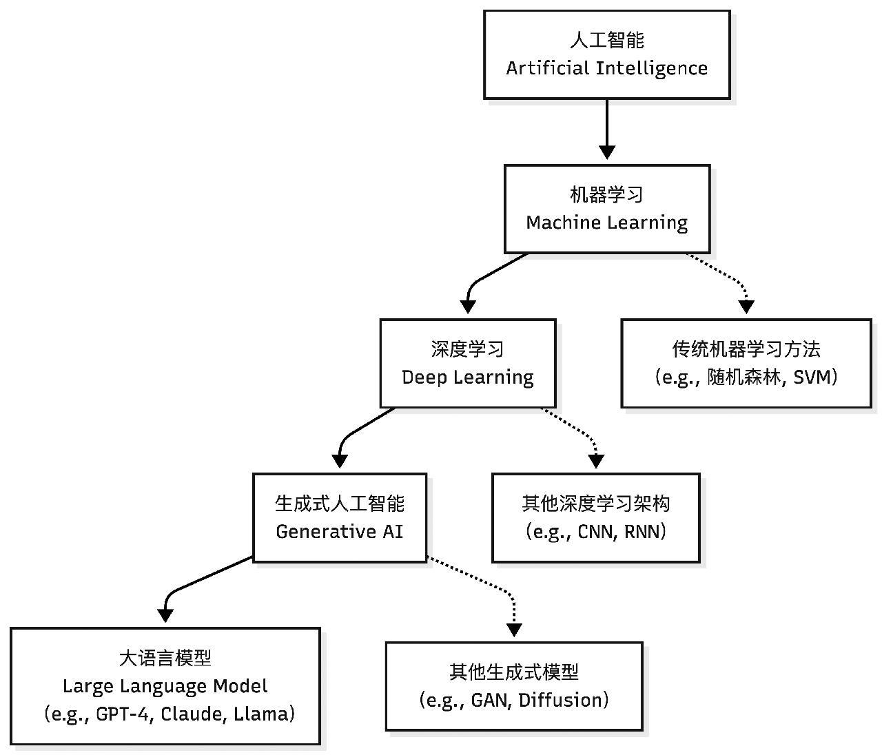AI辅助编码建立在多层次技术体系之上,其演进路径遵循从人工智能、机器学习、深度学习到生成式人工智能,再到大语言模型的技术发展脉络,如图1所示。这一技术体系体现了从基础理论到工程实现的逐层递进关系。
