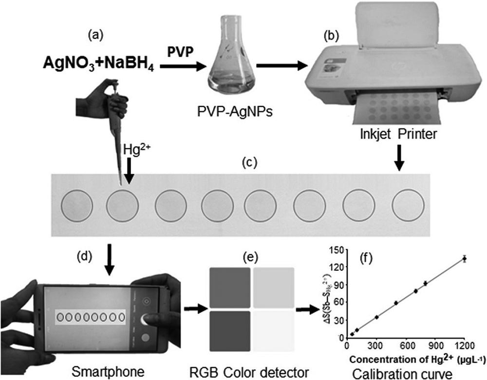 便携式传感器是一项无需复杂前处理的即时检测技术[11],操作简便,检测周期较短,可实时检测。Guo等[12]成功开发了一种基于365 nm紫外灯激发的便携式快速分析试纸。将该技术与移动端分析相结合,通过智能手机成像系统可以实现Hg2+浓度变化的半定量监测。该技术可以有效降低检测成本,并且适用于户外实时检测。Monisha等[13]提出了一种将材料工程与智能算法相结合的喷墨印刷银纳米粒子便携传感器,如图1所示。该传感器借助智能手机和颜色识别应用程序,主要用于环境水样中Hg2+的现场测定。采用喷墨印刷技术将银纳米粒子精准沉积于滤纸,Hg2+诱导的溶胶—凝胶转变引发黄色至棕色的显色反应。通过手机颜色检测器提取颜色参数,结合色彩空间模型消除环境光干扰,对印刷纸上的Hg2+信号强度进行定量分析。与传统试纸检测方法相比较,该传感器响应速度快、成本低廉。