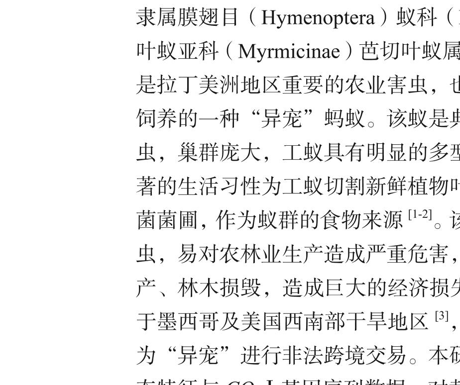 墨西哥芭切叶蚁Atta mexicana (Smith,1858),隶属膜翅目(Hymenoptera)蚁科(Formicidae)切叶蚁亚科(Myrmicinae)芭切叶蚁属(Atta spp.),是拉丁美洲地区重要的农业害虫,也是近年来兴起饲养的一种“异宠”蚂蚁。该蚁是典型的社会性昆虫,巢群庞大,工蚁具有明显的多型现象。其最显著的生活习性为工蚁切割新鲜植物叶片用以培植真菌菌圃,作为蚁群的食物来源[1-2]。该蚁为多食性昆虫,易对农林业生产造成严重危害,可导致作物减产、林木损毁,造成巨大的经济损失[2]。该蚁原产于墨西哥及美国西南部干旱地区[3],近年来常被作为“异宠”进行非法跨境交易。本研究综合分析形态特征与COⅠ基因序列数据,对截获的活体蚂蚁进行鉴定,旨在为口岸检疫鉴定提供快速、准确的技术支持。